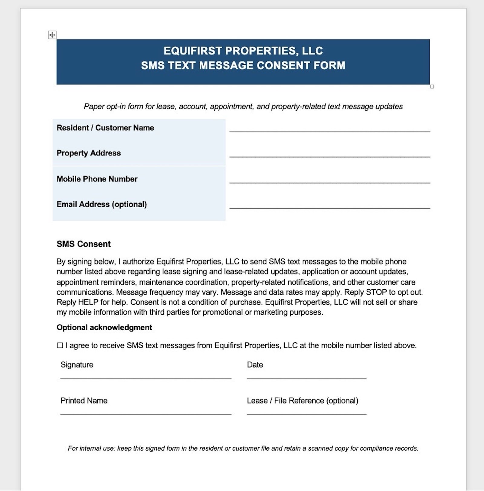 A copy of our signed SMS Consent Form is retained in each resident or customer